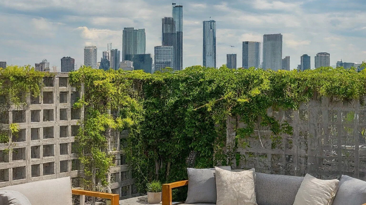 A serene rooftop garden in the city, surrounded by Breeze blocks with plants cooling the area. Making it a perfect hideout in a busy city.