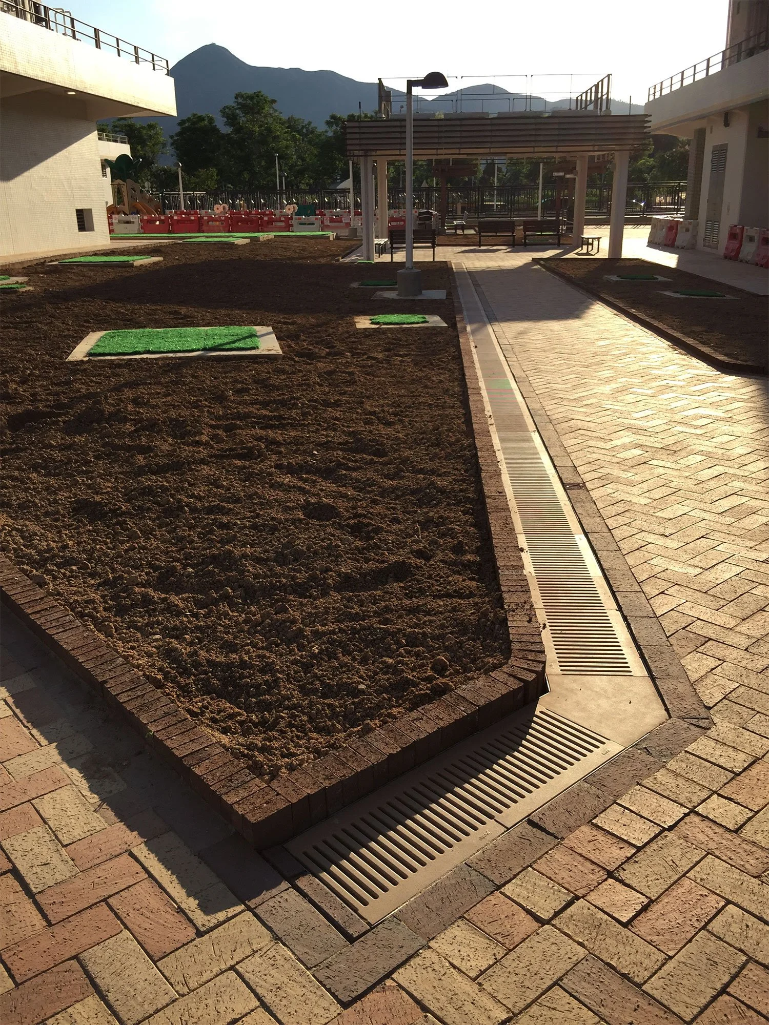 Champagne yellow custom straight and curve gratings were selected to provide covers for the drainage surrounding the myriad of amenities.
